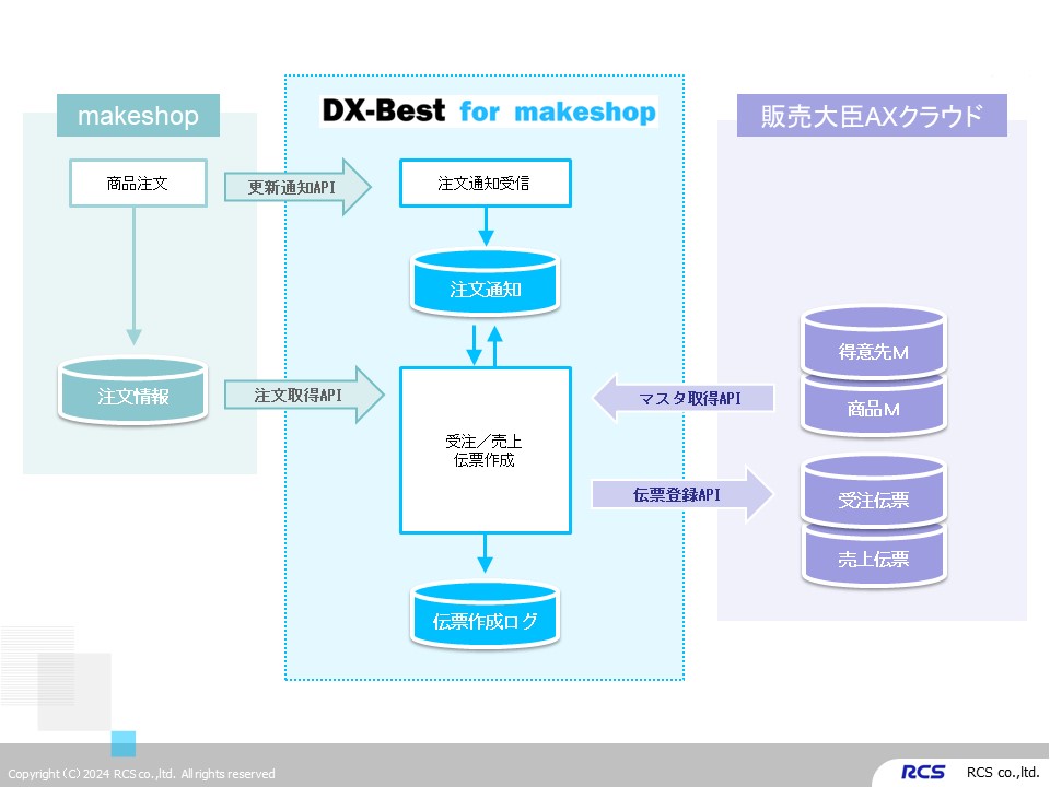 「makeshop BtoBオプション」と「販売大臣AXクラウド」間で、注文データの連携と伝票作成を行う中間システムです。